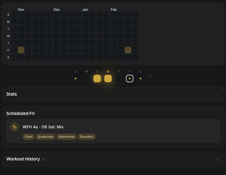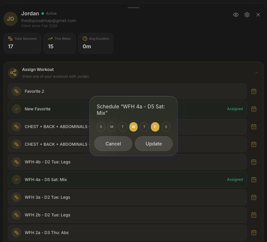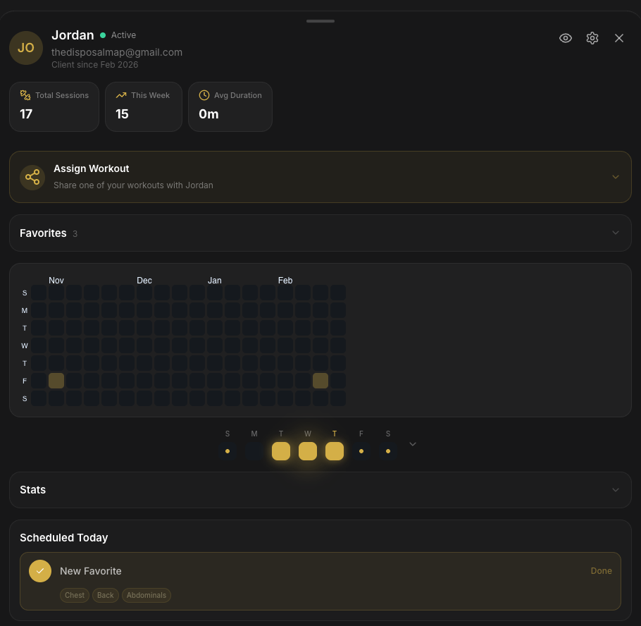 See every client's stats, activity heatmap, scheduled workouts, favorites, and full workout history — all in one beautiful detail view. Know exactly where they are in their journey.