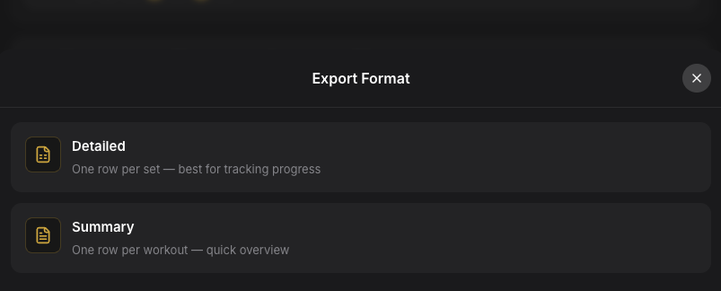 Export detailed or summary workout data for offline analysis.