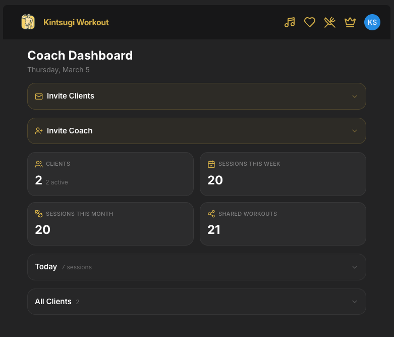 Clients download the Kintsugi Workout app (iOS or Android), accept your invitation, and your assigned workouts appear automatically in their app.