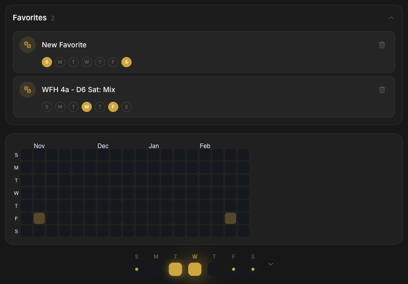 Set favorites and schedule workouts by day of the week for each client.